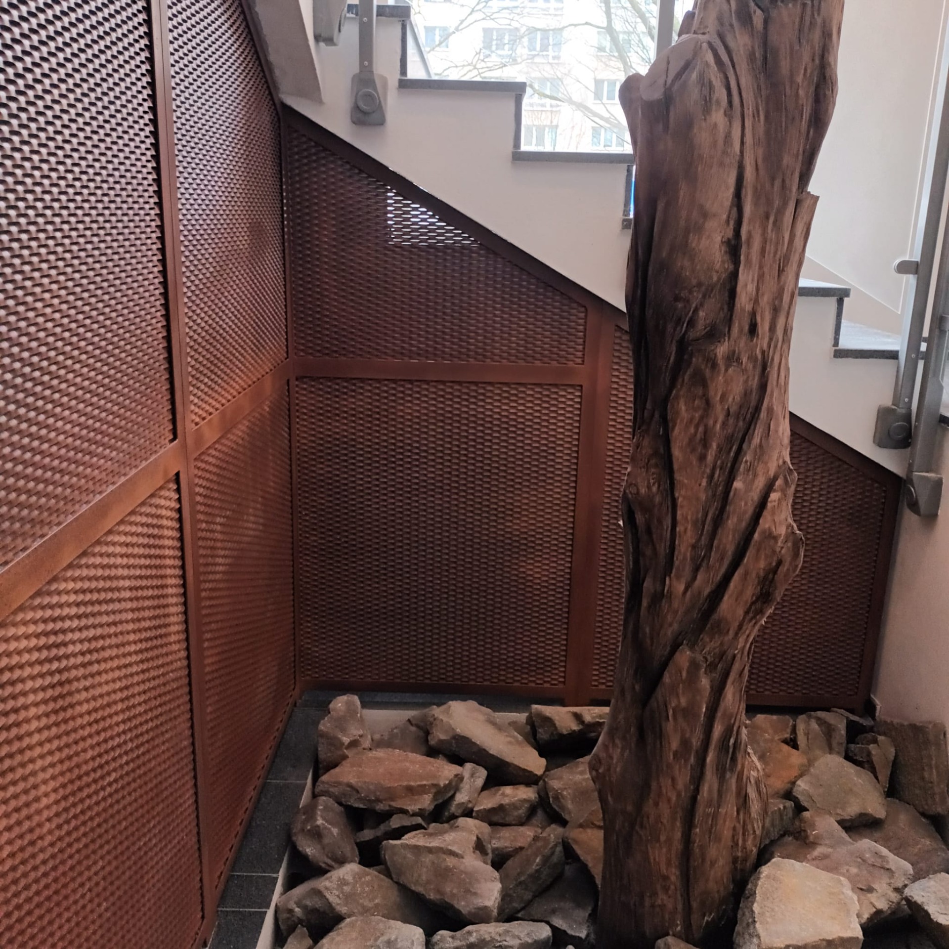 U této zástěny padl výběr na klasický tahokov, který po pečlivé a vrstvené povrchové úpravě získal vzhled cortenu.